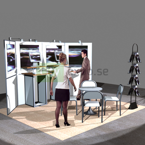 Ett bord, fyra stolar, ett broschyrställ och två datapodier (datorer inkluderas inte).